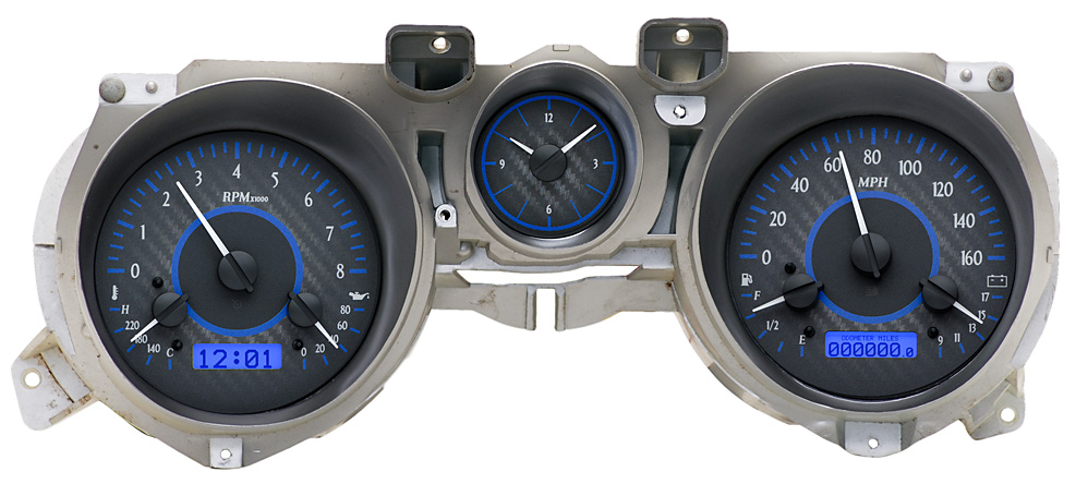 Thanks to several high-profile builds, the 1971-73 Mustang is gaining ground in the hot rodding community. Put yourself on top of the wave with fresh new instrumentation fitted to the stock gauge bezel and housing. Six analog gauge readouts plus an analog clock play host to dual LCD message centers capable of displaying plenty of information. Solid-state sensors are supplied, making this system an obvious choice when upgrading the drivetrain!