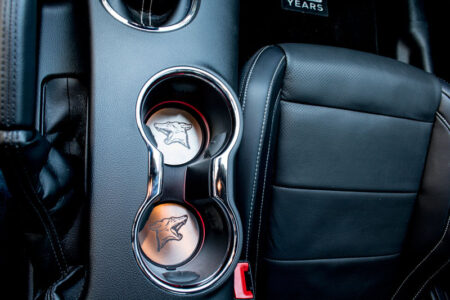 American Car Craft Brushed Stainless Steel Cup Holder Inserts with Coyote Logos for all 2015-2025 Mustangs